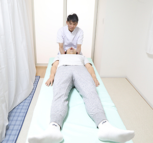 施術は、患者様の首、肩、肘、腰(特に股関節)及び膝の関節を動かして身体の筋肉を緩めて体中の緊張を取っていきます。